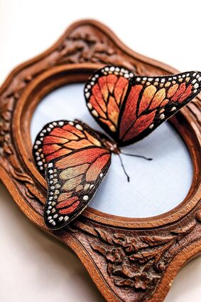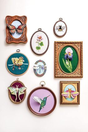 (‘stumpwork’) met draadschildertechnieken, waardoor elk werkstuk tot