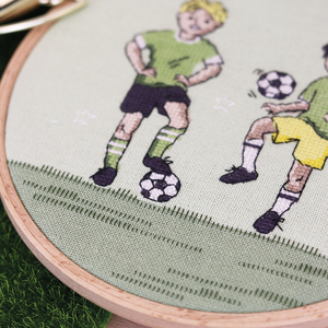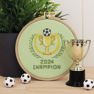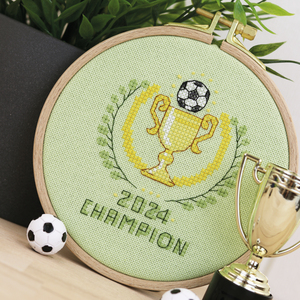 20 x 20 cm Zweigart evenweave Murano (32 count - kleur 6083 groen) voor het borduren van de kampioensbeker. DMC of Anchor garen in de op de teltekening genoemde kleuren. Borduurnaald met stompe punt nr. 22-24. Borduurschaartje. Rijggaren. Borduurring.