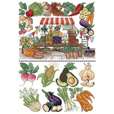 Patroonvel van A3 formaat met diverse motiefjes om te borduren: marktkraam, groenten.