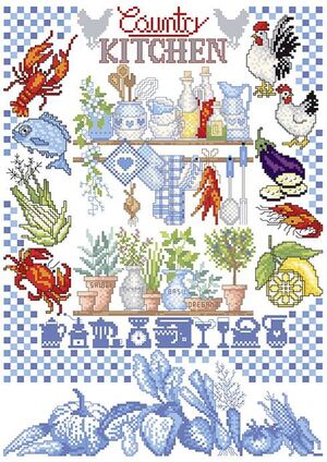 Patroonvel van A3 formaat incl. garenlijst met diverse motiefjes om te borduren: keukenkruiden, keukengerei, pannenlap, kip, azijn, kop, vis, krab, groenten, citroen, aubergine, olie, chili, haan, ui, kreeft, theedoek, garnalen, venkel