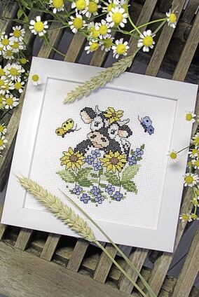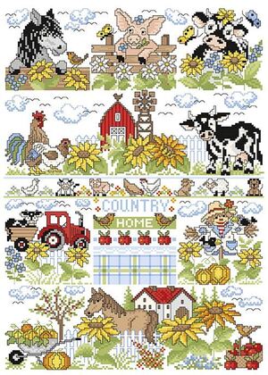 Patroonvel van A3 formaat incl. garenlijst met diverse motiefjes om te borduren: boerderij, kip, paard, schaap, gans, kraai, hond, vogelverschrikker, appels, konijntje, pompoen, roodborstje, wolk, haan, hemel, vlinder, varken, kruiwagen, zonnebloem, koe.