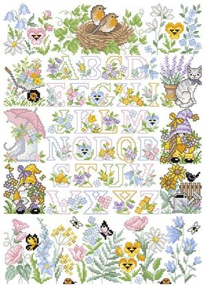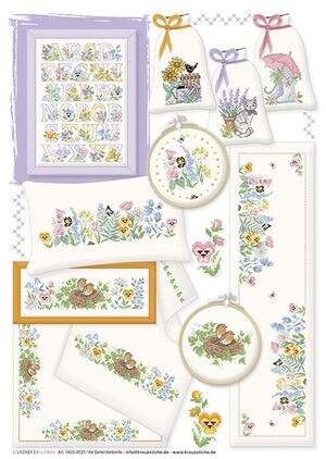 Patroonvel van A3 formaat incl. garenlijst met diverse motiefjes om te borduren: kat, hek, roodborstje, lieveheersbeestje, zonnebloem, bij, vlinders, gieter, kabouters, lavendel, kruiwagen, paraplu, nest, ABC, wilde bloemen, merel, laarzen.