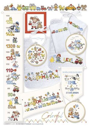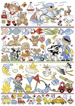 Patroonvel van A3 formaat incl. garenlijst met diverse motiefjes om te borduren:Zeemeeuw, postbode, zon, snoep, vis, brief, muis, spoorweg, teddy, worm, konijn, maan, ster, brandweer, octopus, meisje, vuur, auto, zee, hond, brandweerman, klavertje vier, reekalf, kat, kinderschoenen, koe, uil, bal, paddestoel, baby, vlinder, kruiwagen, piraat, ballonnen, verpleegster, zeester, ooievaar, bloemen, zeilboot, zeeschelp, speelgoed