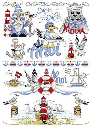 Patroonvel van A3 formaat incl. garenlijst met diverse motiefjes om te borduren: vuurtoren, zeilbootjes, meeuwen