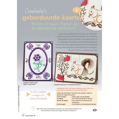 Patroon Crealoekie's geborduurde kaaren 'Bloem in paars frame' en 'Knabbelende eekhoorn'