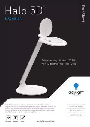 De Daylight Halo loeplamp is een compacte loeplamp met ledverlichting. Hij is licht van gewicht, inklapbaar en heeft een flexibele arm. De loeplamp heeft krachtige leds die in drie verschillende lichtstanden (4000-1600-400 Lux ) dimbaar zijn. Hij is dus ideaal om te gebruiken op uw bureau of tijdens het uitvoeren van uw hobby.