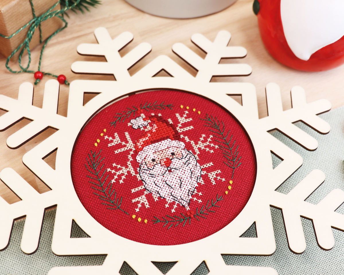 • Houten sneeuwvlokframe of borduurring (ca. 13–15 cm Ø)