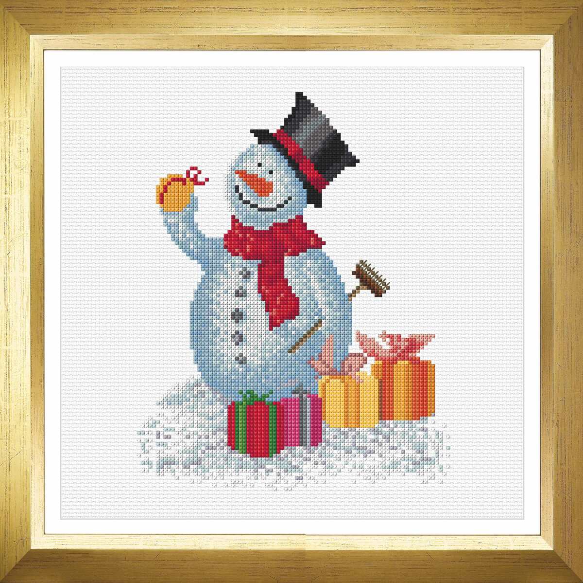 De vrolijke sneeuwpop met zijn hoge hoed, rode sjaal en armen vol