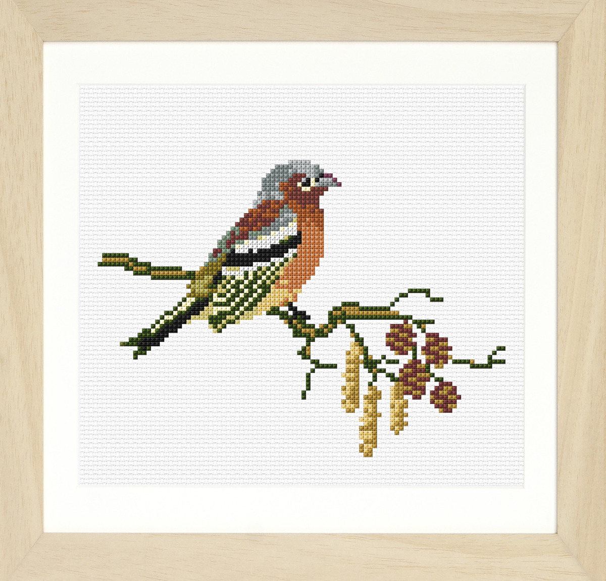 van borduren in natuurlijke tinten - deze vink op zijn tak is een heerlijk