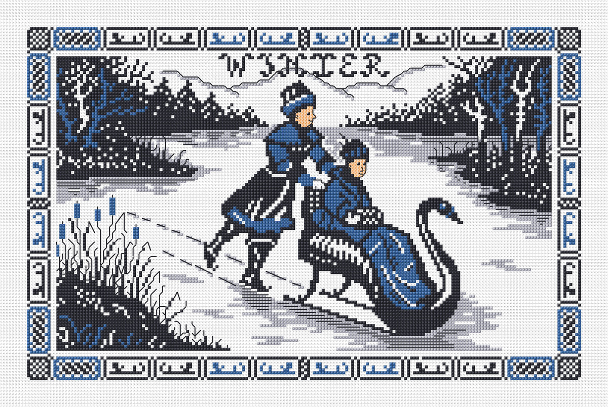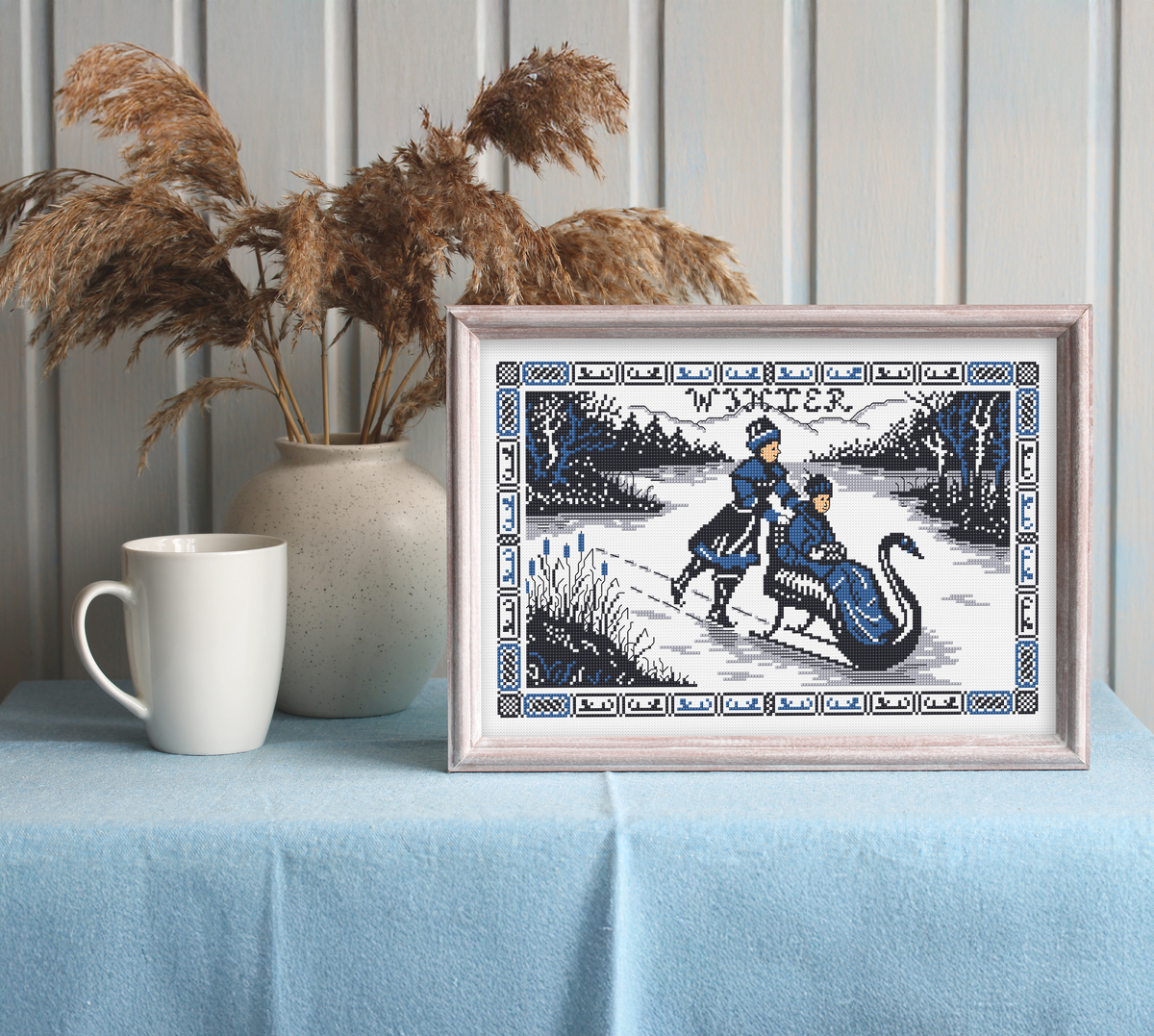 sfeervol winters beeld van schaatsers op het ijs, omlijst door een decoratieve