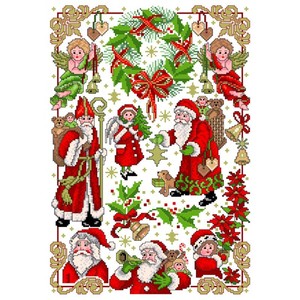 Patroonvel van A3 formaat incl. garenlijst met diverse motiefjes om te borduren: Kerst, kerstman, engelen, kerststerren.