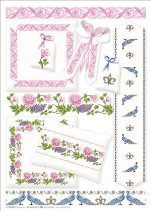 Patroonvel van A3 formaat incl. garenlijst met diverse motiefjes om te borduren: alfabet, bloemen, randjes.