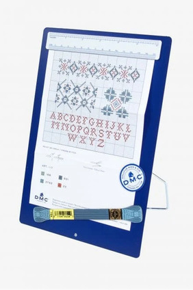 Magneet bord om je borduurpatroon op vast te klemmen, werkt ook gelijk als naaldmagneet. Met een standaard rechtop te zetten. Er zitten 3 magneten op, een in de vorm van een liniaal een in de vorm van DMC garen strengetje en een in de vorm van het DMC logo.