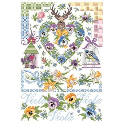 Patroonvel van A3 formaat incl. garenlijst met diverse motiefjes om te borduren: bloemen, hert, vogelhuis, vogelkooi, randjes,