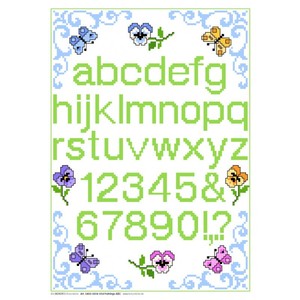 Patroonvel van A3 formaat incl. garenlijst met diverse motiefjes om te borduren: viooltjes, alfabet, vlinders.