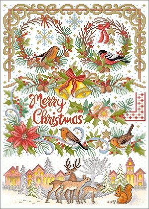 Patroonvel van A3 formaat incl. garenlijst met diverse motiefjes om te borduren: Kerstmis, kerstkrans, vogels, herten, randjes, huisjes.
