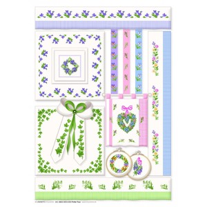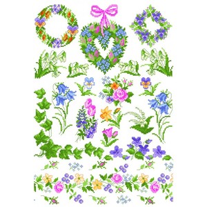 Patroonvel van A3 formaat incl. garenlijst met diverse motiefjes om te borduren: bloemen, bloemkransen, randjes.
