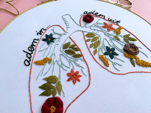 1. Borduur de tekst en en omlijningen van de longen met een split stitch (of back stitch voor beginnende borduurders).