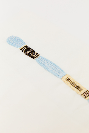 Katoenen stof naar keuze. DMC Blanc, 310, 824, 825 (borduurkaartje). DMC 828, 3761, 519, 746, 310 (strengetje borduurgaren). DMC 613, 3046 en 612 (borduurschaartje). Borduurnaald met scherpe punt. Borduurring. Borduurschaartje. Rijggaren.