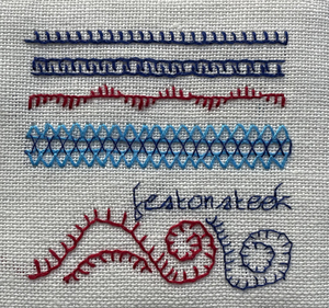 Nan: “Ik moet eerlijk zeggen, de festonsteek is niet moeilijk, maar het kiezen van de juiste positie voor je naald is soms wel moeilijk te zien. Ik werd er wat onrustig van en maakte onder de tekst op deze bladzijde gewoon festonsteken waarbij het niet precies uitmaakt waar je je naald in de stof steekt. En dat is eigenlijk ook wat we nastreven met ons stekenboekje: we willen leren wat ‘losser’ te werk te gaan. Ik geef je een afbeelding van wat ik onder de tekst maakte, maar dat hoeft dus niet exact nagemaakt te worden. Maak vooral je eigen slingertjes!”