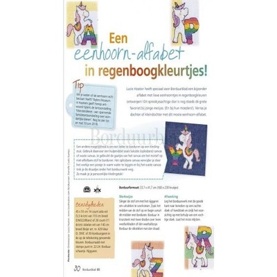 Onderstaande producten zijn net als Patroon Een eenhoorn-alfabet in regenboogkleurtjes! te vinden in Borduurblad 85