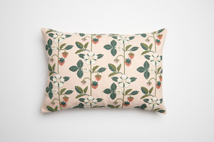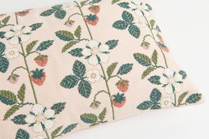 met een botanisch patroon waarin aardbeien de hoofdrol spelen. Het