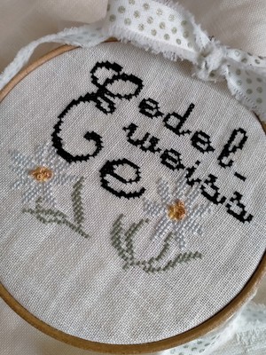 Slinger de stof om met het rijggaren om uitrafelen te voorkomen. Zoek het midden van de stof met behulp van een centimeter en begin vanuit het midden met borduren. Borduur in kruissteek met twee draden over twee weefseldraden volgens het telpatroon op het patronenblad. Borduur de Franse knoopjes en stiksteken met één draad.