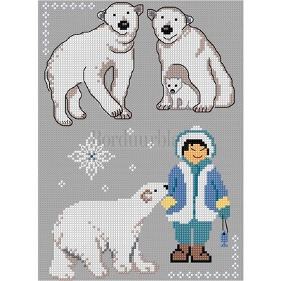 Patroon van vriendelijke ijsberen en een eskimo. Je kunt ze samen of apart borduren op bijvoorbeeld een kussen of dekservet of mazen op een trui.