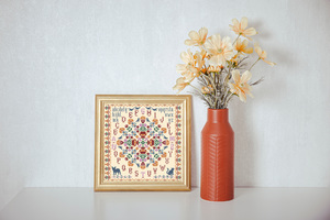 te borduren. Borduur in kruissteek met twee draden over twee weefseldraden of één weefselbosje volgens de teltekening op het patronenblad.